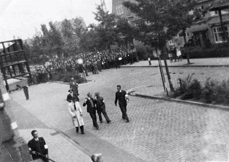 Uiterst links van SD-agent Adrianus Wolterbeek loopt de leider van het PAN-wijkteam, Ad van Eerd. (zonder helm, maar met witte band)