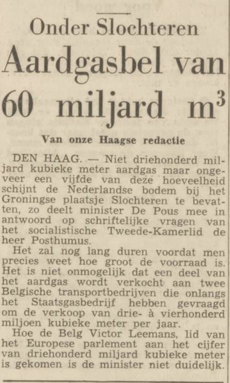 De ontdekking in mei 1959 van de enorme gasbel bij Slochteren was wereldnieuws. Het gasveld zou de Nederlandse Staat en de aardoliemaatschappijen als aandeelhouders, astronomische winsten opleveren. Tot grote ergernis van Arie Smit. En uiteindelijk ook veel problemen veroorzaken voor de Groningse bevolking.