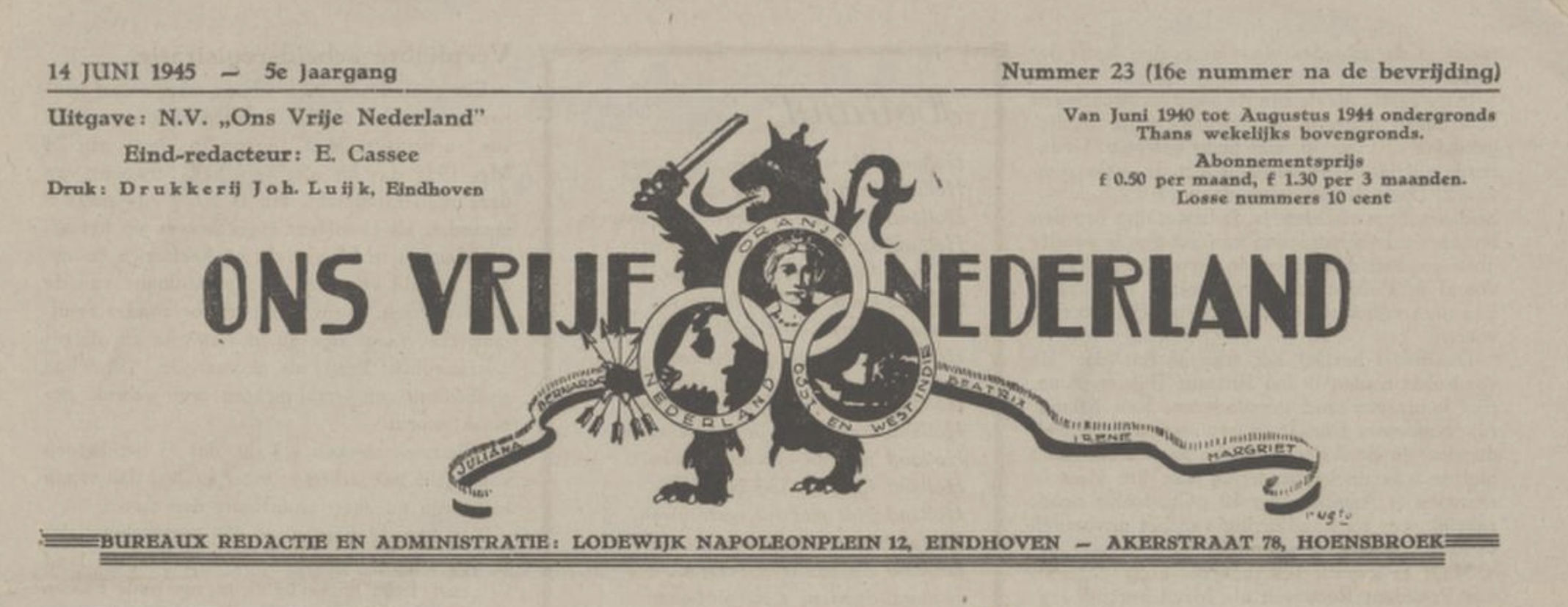 Direct na de bevrijding is het redactieadres voor de streek Oost-Brabant: Binnenwiertzstraat 16 in Eindhoven.