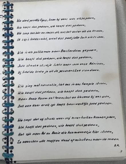 Humor en Taalgebruik: De toon is licht en vrolijk. Het gebruik van informele, bijna koddige woorden zoals de onderduikers die "op een kluit" zitten met een "lach op hun snuit", laat zien dat de schrijver probeert de sfeer luchtig te houden. Het gedicht heeft de sfeer van een lied voor een feestavond, wat de poging om normaliteit te creëren verder versterkt.