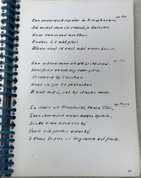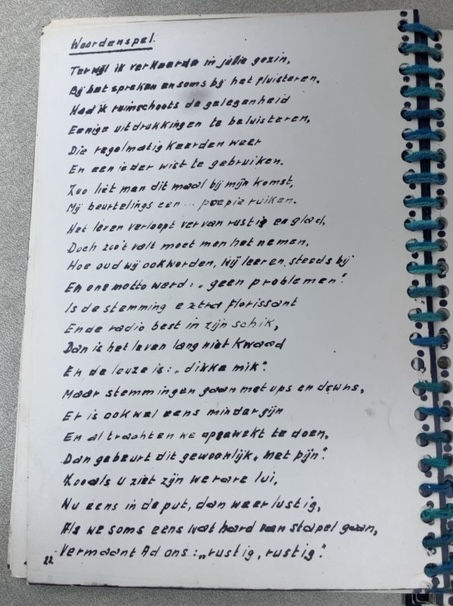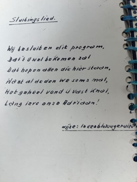 Zo'n jaardag is maar eens in 't jaar, Dus maakten wij 't een en ander klaar. Want volgend jaar om dezen tijd Dan zijn wij stellig weer verspreid. Wij zijn geen artisten van beroep, Toch kwam er dra een kleine groep. Die draaide vlug iets in elkaar, Dat 't leuk is, hoop ik maar.