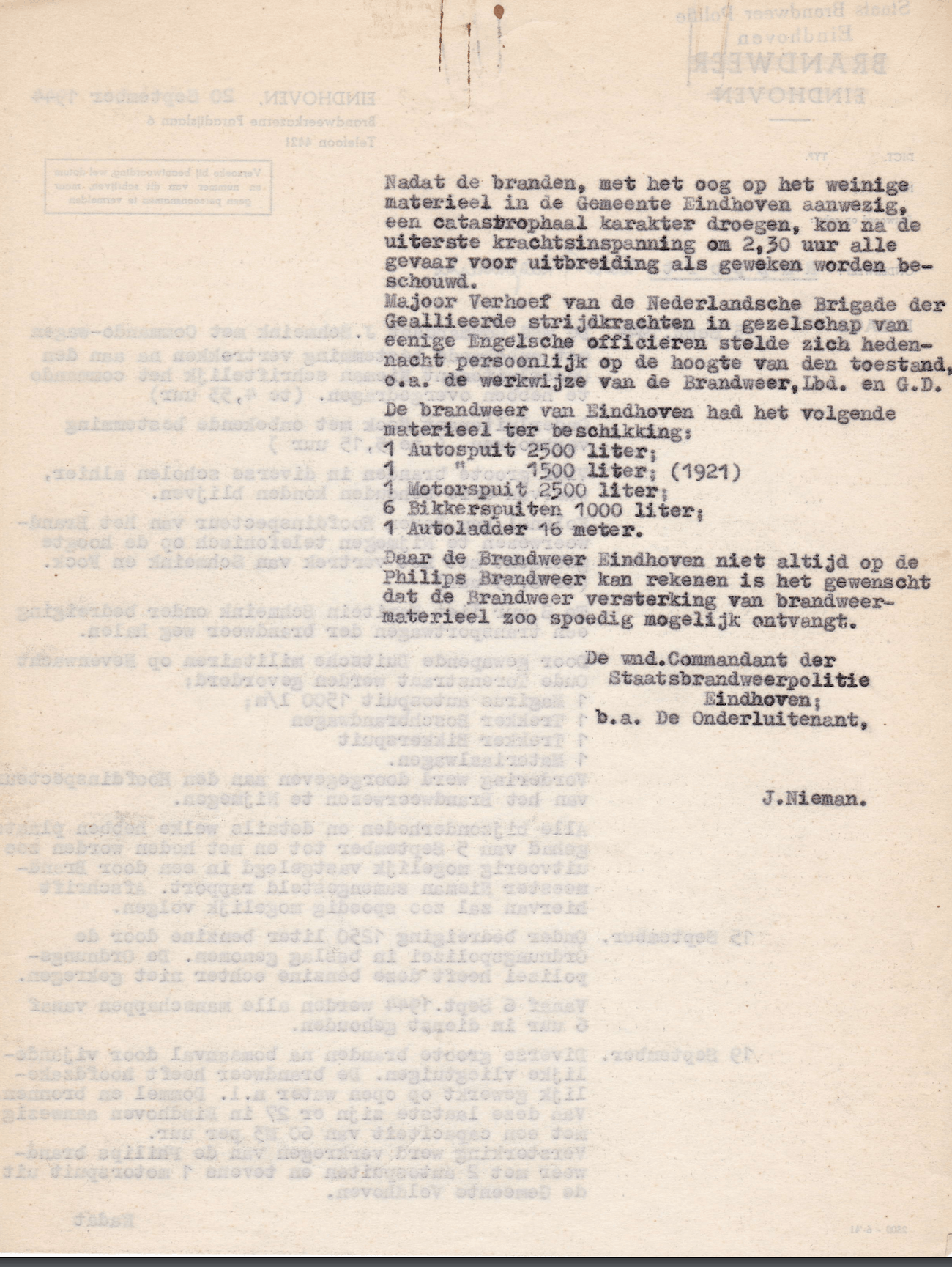 Paar dagen voor de bevrijding van Eindhoven, op 5 september 1944, wordt de heer J. G. Nieman commandant van de “Staatsbrandweerpolitie” (Brandweer Eindhoven). J. G. Nieman neemt het commando over van waarnemend commandant J. Schmeink (NSB'er), die met onbekende bestemming vertrekt met een opgeëiste commandowagen van de Eindhovense brandweer. Ook onderluitenant Fock, een NSB'er die in 1944 vanuit Rotterdam was overgeplaatst naar Eindhoven, vlucht diezelfde nacht. De bevrijding van Eindhoven was nabij. Het document, meer een kladblaadje, bevat de tekst: "Tot nader order draag hiermee het bevel over de staatsbrandweerpolitie over aan onderluitenant J. Niemann."
