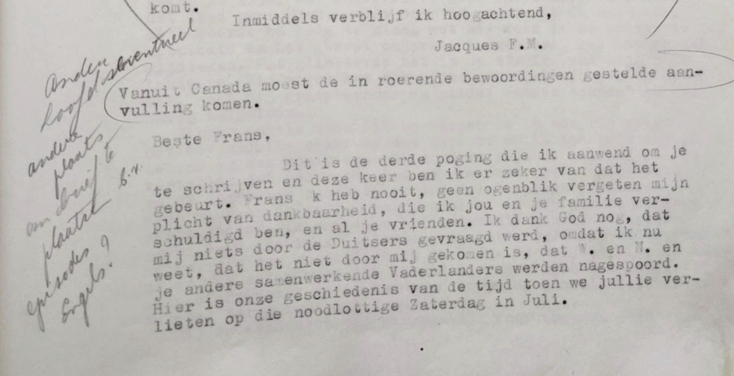 Ik dank God nog, dat mij niets door de Duitsers gevraagd werd, omdat ik weet, dat het niet door mij gekomen is, dat W. en N. en je andere samenwerkende Vaderlanders werden nagespoord. Hier is onze geschiedenis van de tijd toen we jullie verlieten op die noodlottige zaterdag in juli 1944.