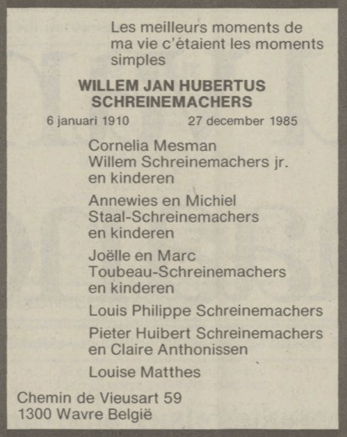 Staat op zijn overlijdensadvertentie in de NRC van 28-12-1985.