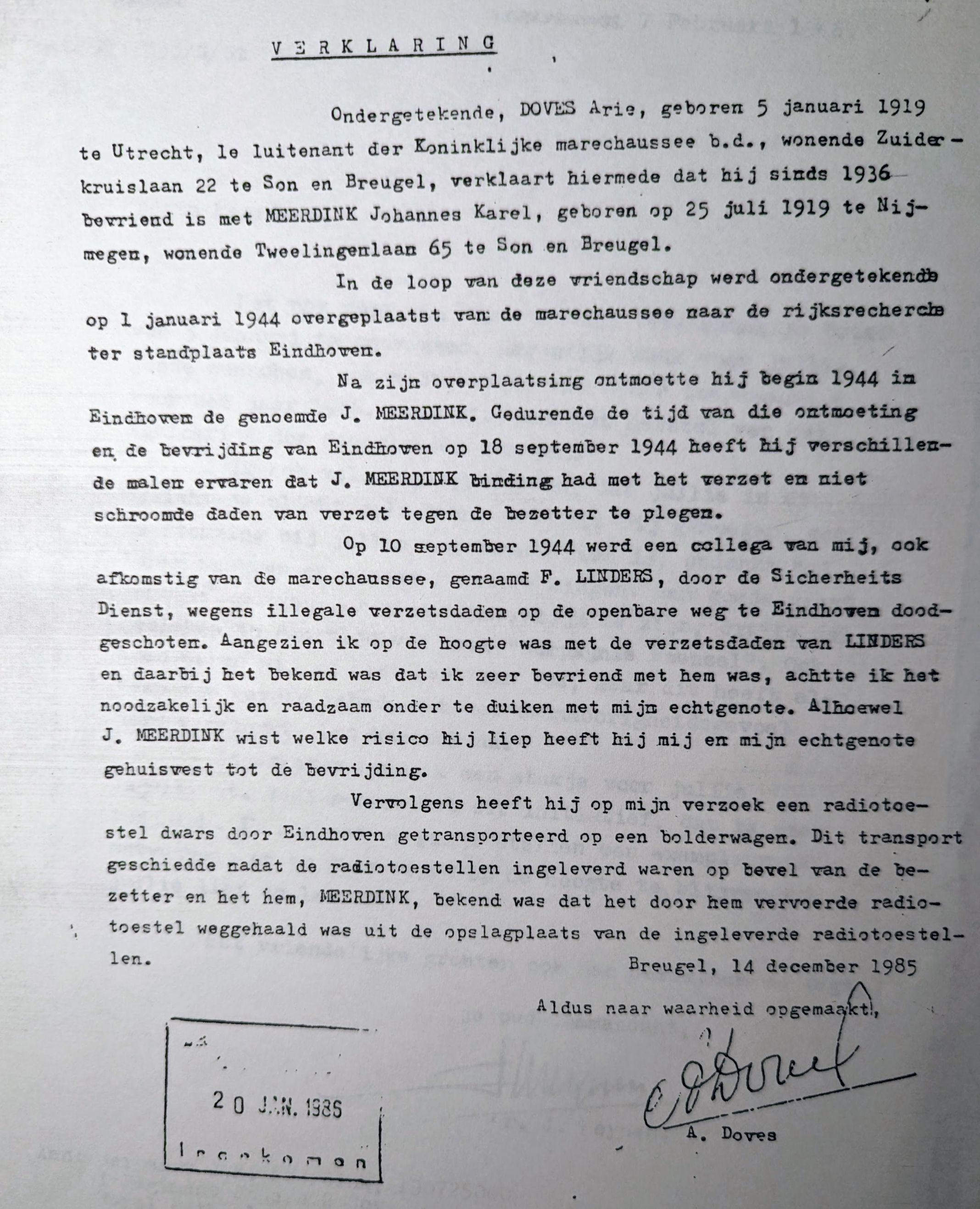 Mevrouw S. Wijtman-Vleer: 'Meerdink werkte nauw met mijn moeder samen, hielp bij het zoeken naar onderduikadressen, en bracht ons ook regelmatig onderdelen voor zendapparatuur. Er kan misschien niet gesproken worden van heldendaden, maar ze hebben veel voor anderen betekend, en vaak onder gevaarlijke omstandigheden. Hij heeft er zich na de oorlog nooit op laten voorstaan.'