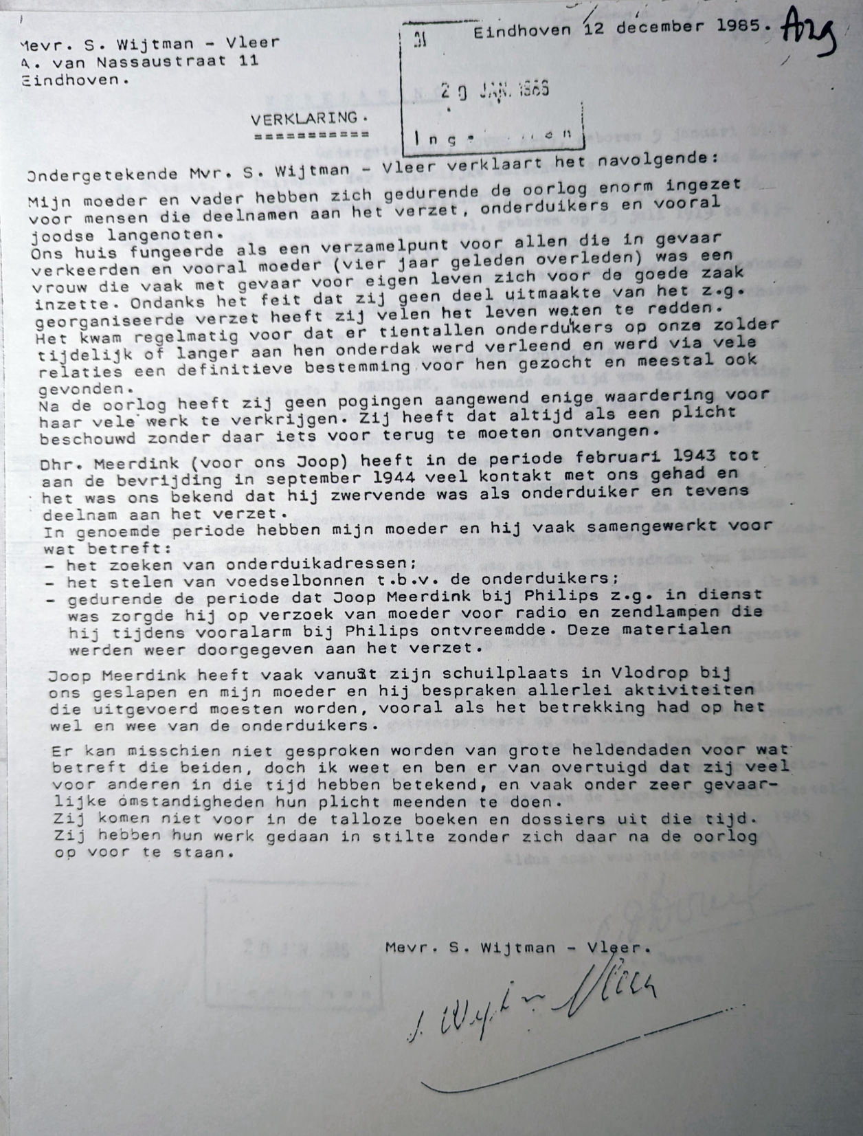 Ondergetekende Mvr. S. Wijtman - Vleer verklaart het navolgende: Mijn moeder en vader hebben zich gedurende de oorlog enorm ingezet voor mensen die deelnamen aan het verzet, onderduikers en vooral Joodse landgenoten.