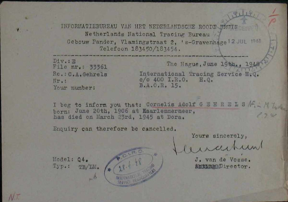 Hoewel de organisatie of het fonds nooit een naam gedragen heeft, was zij toch aan velen onder bovengenoemde naam bekend. Het komt ons voor dat wij den Heer C. A. Gehrels, de stichter en onvermoeide werker van dit fonds, die ons allen door zijn bezielende woorden en nobel voorbeeld steeds aangespoord heeft dit werk voort te zetten en uit te breiden, niet beter kunnen eren, dan door zijn naam voorgoed aan dit werk te verbinden. Hij werd het slachtoffer van zijn menslievend werk en werd door de Duitsers voor zijn nobel streven beloond met het lijden in hun beruchte concentratiekampen tot hij in januari 1945 [ de juiste datum is 23 maart 1945] overleed in het kamp DORA, bij Nordhausen.